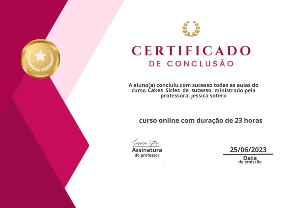 Parabéns pela conclusão do Curso Cakes Sicles De Sucesso Agora, você terá acesso a um certificado de conclusão exclusivo, que pode ser emitido diretamente da sua área do aluno. Este certificado é um lindo reconhecimento do seu esforço e dedicação ao longo do curso. Aproveite essa conquista e compartilhe o seu sucesso com orgulho!